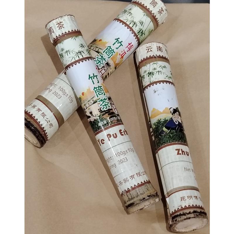 Le Pu Erh Zhu Ye 2023 - Pu Erh Shu pressé dans le bambou est un thé Pu Erh Shu d’exception, originaire de la région de Menghai, dans la province du Yunnan, en Chine. Ce thé rare se distingue par son mode de fabrication unique : il est pressé et affiné à l’intérieur de tiges de bambou, selon une tradition artisanale du sud du pays.